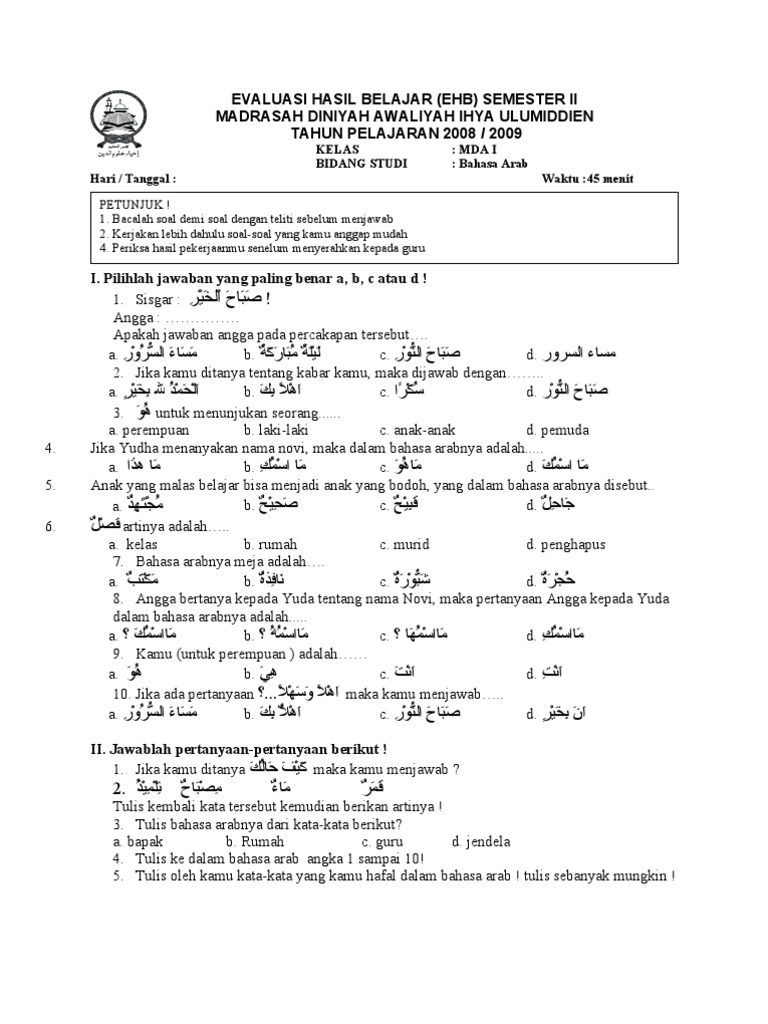 Silahkan beritahukan kepada kami jika soal tersebut tidak ada kunci jawabannya atau jawabannya soal bahasa arab semester 2 kelas 1. Adapun informasi yang akan saya sampaikan pada saat ini adalah soal latihan uts/pts kelas 2 semester.